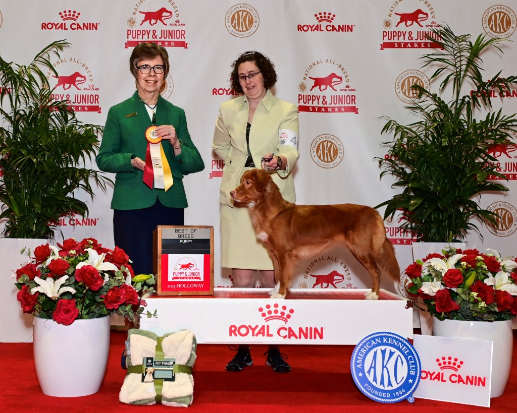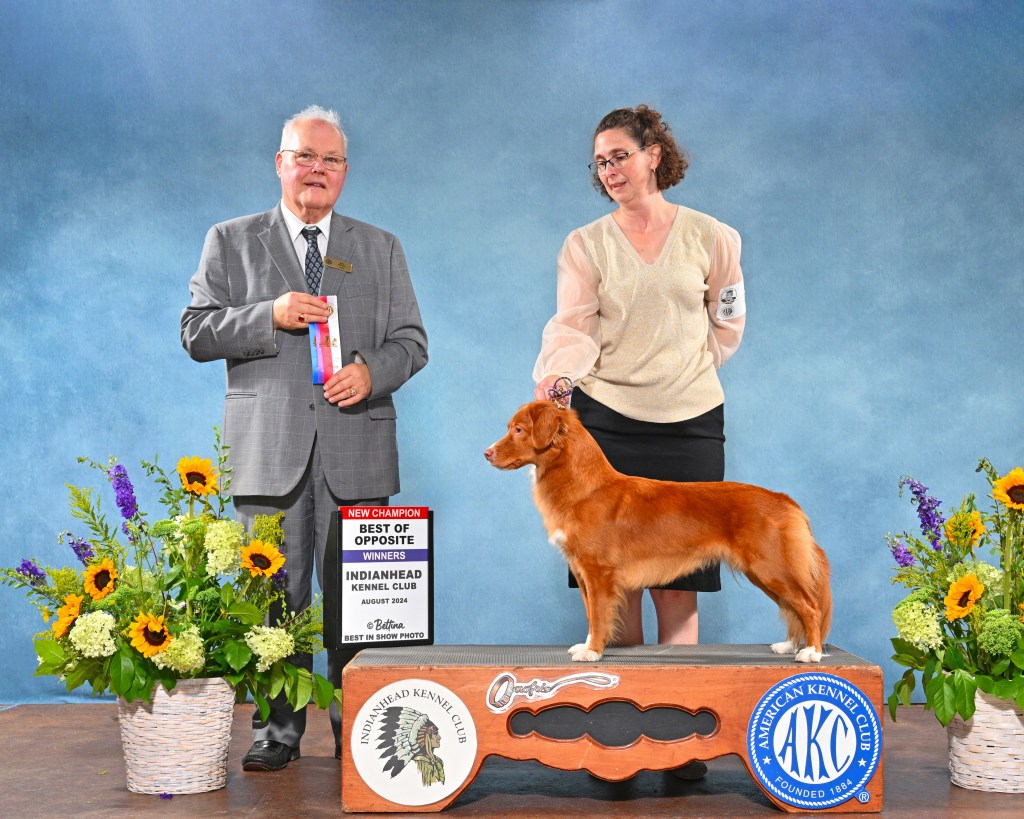 Moonshine came into our lives because a friend relayed to me that Moonshine’s breeder was looking for an experienced Toller home for their sassy little girl. Moonshine has attitude tenfold! She is sweet, but alert. She has a bit of FOMO and will scream. She LOVES water, and thinks she must retrieve something, ANYTHING, in order to come out of the water.