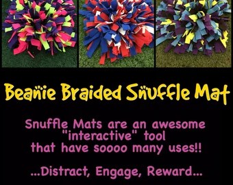 Nancy Nye owner of Beanie Braided Leashes creates tugs toys and snuffle mats that have stood up to the hard play of Huckleberry. I have used other products, but nothing compares to the snuffle mats and hol-ee roller tug toys that Nancy makes. The fleece remains tightly tied together. Please note these are interactive toys. You should even be present when your pup hunts through the snuffle mat. To see all of her offerings, click here.